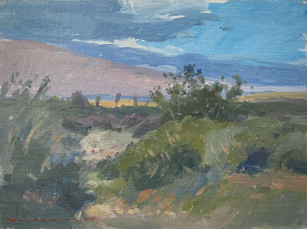 "The sun set behind me as a storm advanced from the east, carrying high winds. Rain fell heavily that night, whipping my camp around. I painted quickly as the sand began to rise."